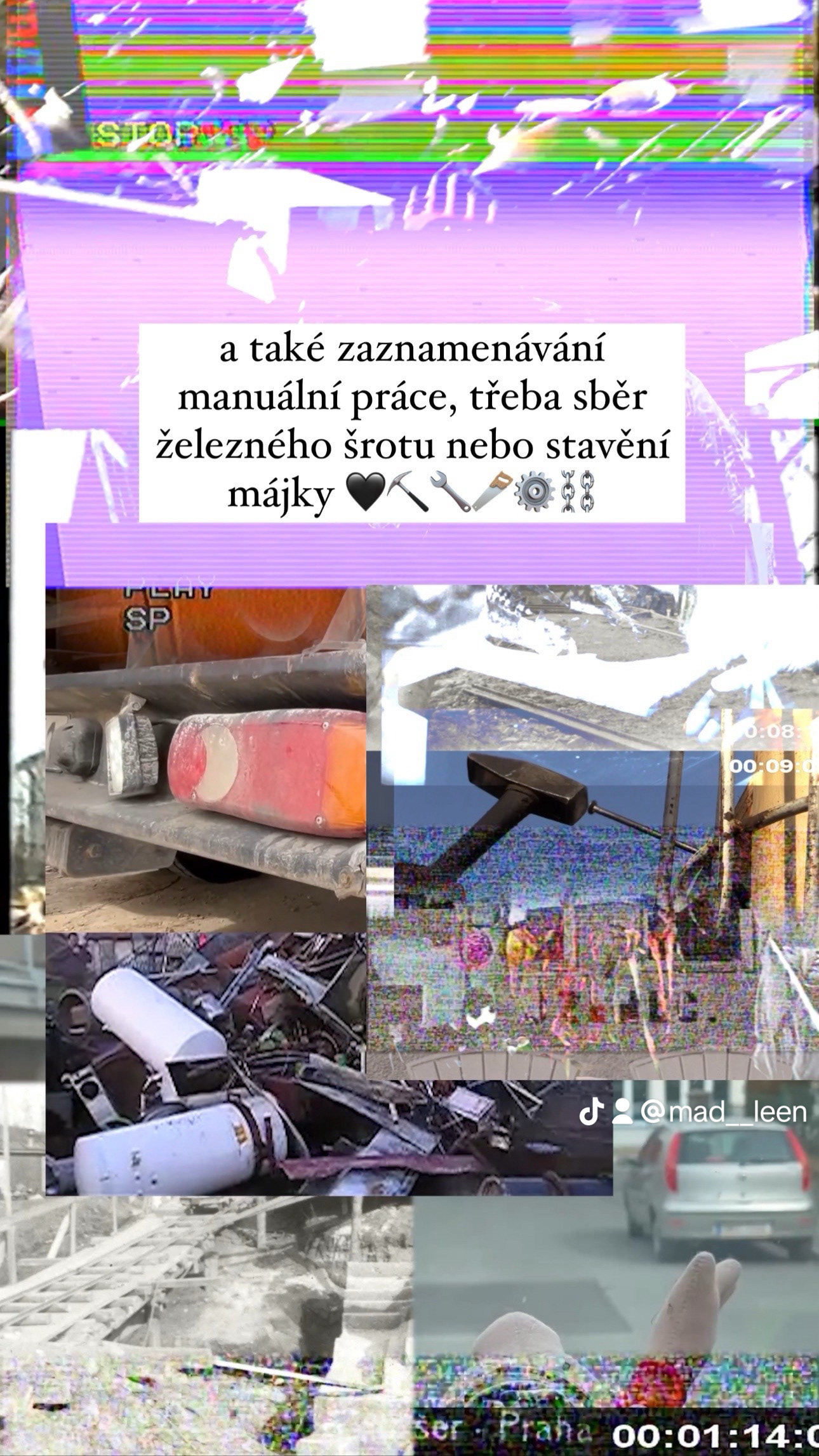 Momentem zahlcení vzniká organický „valivý“ celek, připomínající spíše jednolitou animaci, namísto rozpoznatelnosti jednotlivých zdrojů. Přehlcený obraz a splitscreeny odkazují na frenetičnost sociálních sítí a zkracující se schopnost soustředění. Pracovala jsem s destrukcí obrazu, který je nedokonalý, stejně jako proces vzpomínání a paměťové nosiče, které postupně degradují.