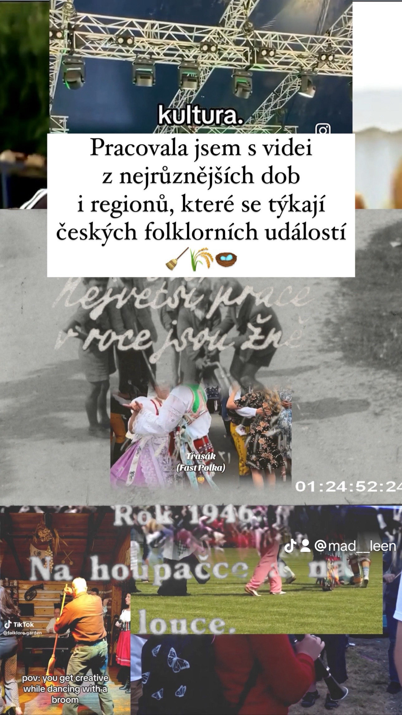 15 umělců vytvořilo video na míru jedné z vážnohudebních skladeb dle výběru. Moje video reaguje na úryvek skladby Suita Rustica (1938) od Vítězslavy Kaprálové, která se zde přímo inspirovala folklorem. Já jsem se taktéž zaměřila na lidové motivy spojené jak s fyzickou prací (a vlastně její oslavou tím, že je zaznamenávána), tak s „výměnou rolí“ (karnevaly, masopusty...). Zdroje z Youtube nebo TikToku reprezentují prolínání časových rovin, formátů a kolektivní paměti.