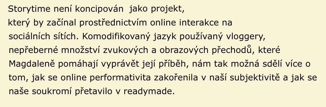 „Storytime je výpověď, deníkový záznam a příběh o dospívání umělkyně Magdaleny Kašparové, zabývající se soukromím, subjektivitou a autentičností online sdílení. Co sdílíme, co je soukromé a jaké jsou možnosti sebeprezentace v současné kultuře, založené na obrazovce? Magdalena přijímá konvence YouTube vlogu a její deníkové záznamy z doby dospívání se zde vynořují syrové a zdánlivě neupravené. Jsou skryty ve sbírce starých a dávno nepoužívaných mobilů – v písničkách, gifech, rozpixelovaných obrázcích a videích.“